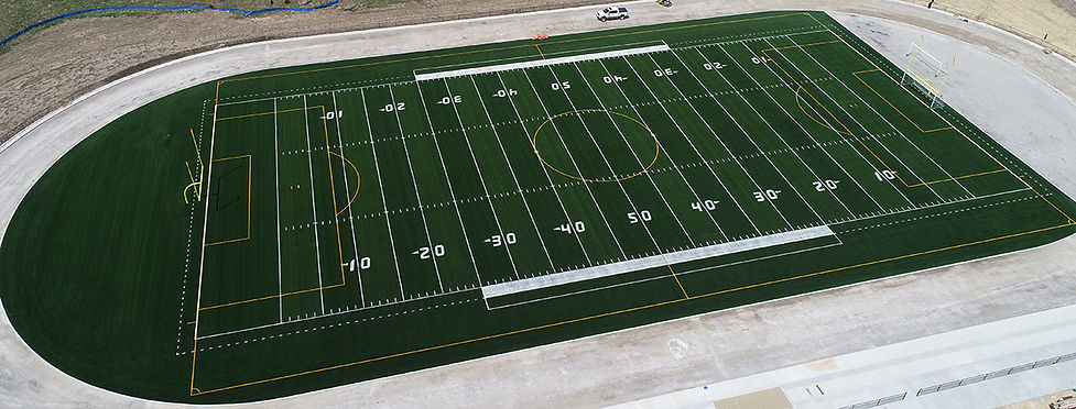 MWSTP worked with school officials to create a striking field with a fierce 3-color midfield logo in the center of the field. Other features include alternating 5-yard green panels, colored end zones, dual-colored end zone lettering, football markings with shadowed numbers, football field perimeter, soccer markings and dual-color coaches/team box with additional lettering on the stadium side.